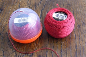 I'm amazed at how fast this project goes. These designs were traced onto the fabric with a Red Micron Pigma Pen. You could also combine two pieces of Stitcky Fabri-Solvy and put the designs onto the fabric that way. Once the design is on the fabric all you need is a hoop, a needle and a ball of DMC Perle Cotton #498 - Turkey Red, or any other color you might like.You might want a Perle Cotton Bubble too so the thread doesn't get tangled while you stitch. Then you're good to go. It is a fantastic take along project!