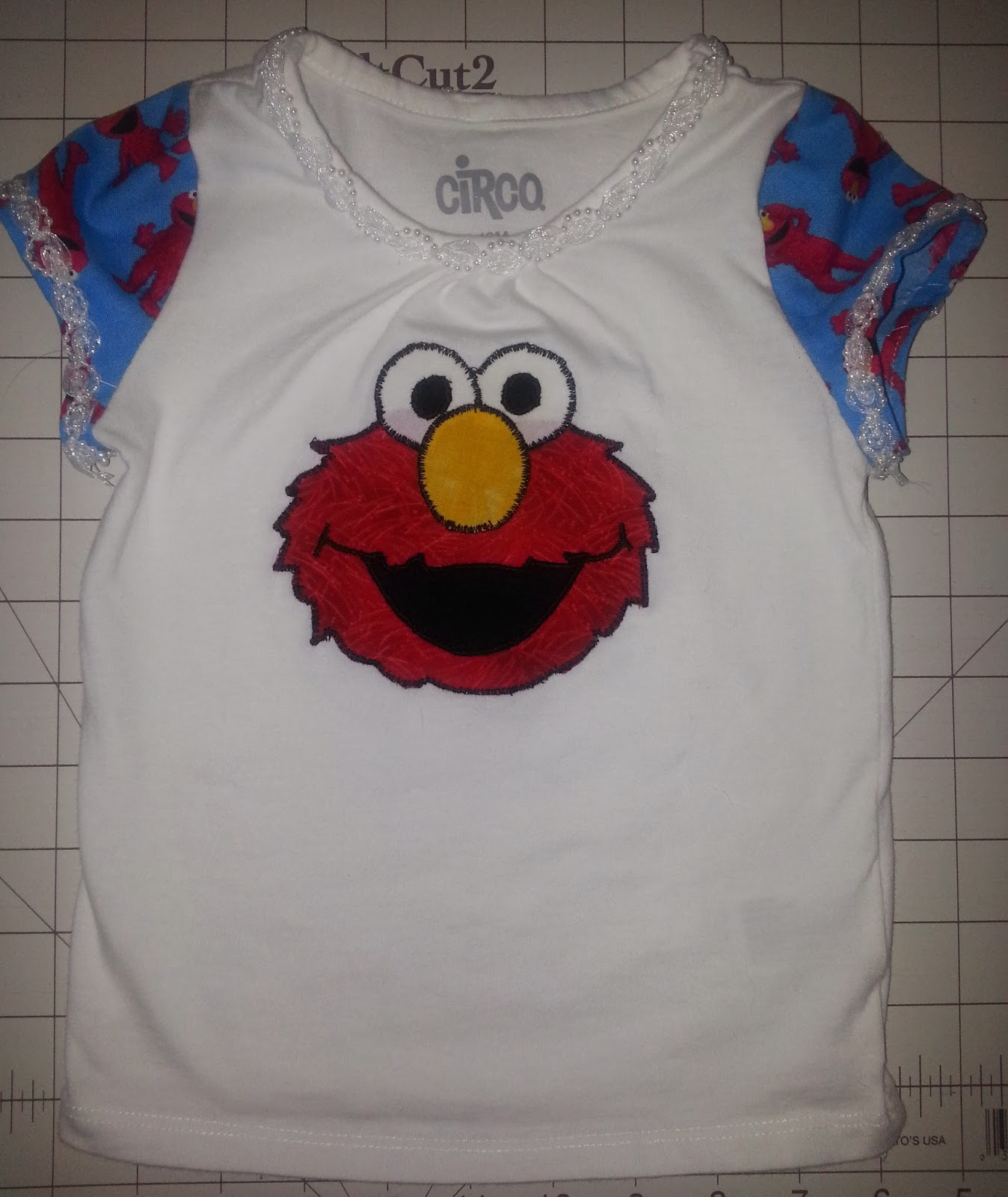My daughter liked it so I told her I'd make it for Tristyn's birthday party. I was at a show over the summer and found a really cute Elmo print in a Fat Quarter so I picked that up. I also found the perfect red fabric. It looks a little bit like red fur so it will make a good Elmo face. My daughter wanted to incorporate pink into the outfit to make it more feminine but pink and dark red don't really go well together. I found some lace at another show that I thought might work. Here is what I'm starting with to make the outfit.